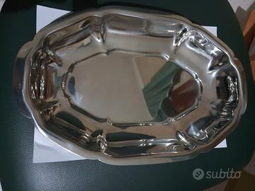 Vassoio inox 18/10 ovale con bordi lavorati colore grigio silver molto lucido. In ottime condizione. Misure: Diametro 34 cm. Lungo 22 cm. H. 5 cm.