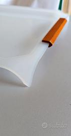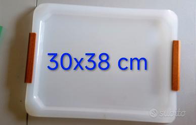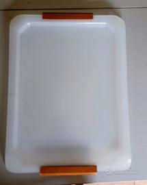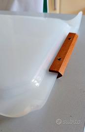Vassoio di design in plexiglas anni 90 della Artnova Scaroni, serie Pitagora. Misura 30x38 cm. Manici in legno di ciliegio.