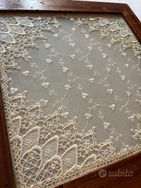 Vassoio in vetro e legno con internamente ricamo in pizzo Arte povera , mai usato , conservato in cantina