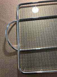 Lino Sabattini incarna l'estetica minimalista e raffinata del designer, con linee eleganti e materiali di alta qualità. Il vassoio presenta una base in vetro trasparente con una rete metallica all'interno, che offre un contrasto sofisticato e tenue con gli accenti arrotondati argentati. La superficie in vetro è liscia e leggermente riflettente e aggiunge un tocco di eleganza e modernità. Gli elementi argentati comprendono una cornice e maniglie arrotondate che si integrano sottilmente nel design del vassoio, rimanendo fedeli allo stile minimalista di Sabattini. Questi accenti netallici sono lucidati a specchio e creano un contorno elegante e ininterrotto intorno al vetro trasparente, evidenziandone la forma senza sovrastarla. I progetti di Sabattini sono noti per la loro semplicità scultorea e il lusso contenuto, quindi questo vassoio funge sia da pezzo funzionale che da accento artistico, perfetto per un ambiente moderno o contemporaneo. Il vassoio è marchiato Lino Sabattini ed è in perfette condizioni.