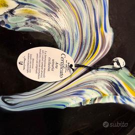Come da foto: impeccabile, senza crepe o scheggiature, con scatola originale. Diametro circa 32 cm (misura con nastro da misura visibile), profondità ridotta, peso contenuto per spedizione facile. Motivi a rilievo ben definiti, effetto iridescente vivo.