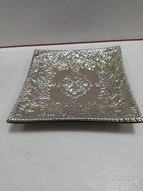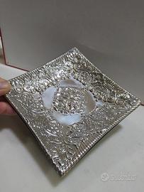 Originale vassoio svuotatasche in preziosa lamina in argento 925 di gr. 5/7, con base in vetroresina blu, di forma a leggera conca e lavorata a bassorilievo; misura cm 15 x 15 x 1 di produzione italiana, azienda argentiera Valenti.