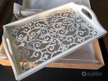 Bellissimo vassoio marchio iDettagli realizzato in resina bianca lucida con maxi decoro a taglio laser e vetro trasparente. Dimensioni: cm 45x30.