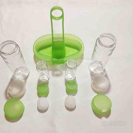 Vassoio verde e oliera in plastica e vetro completa di portasale e portapepe.