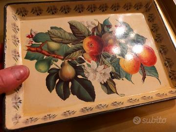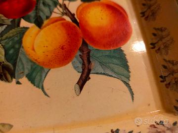 Vassoio vintage rettangolare in metallo smaltato con decorazione botanica di frutta e fiori, anni ’50/’70 circa.