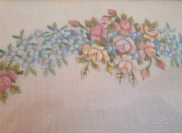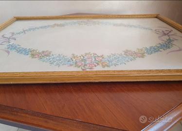 Vendo bellissimo vassoio vintage da portata con ricamo. Un'ottima soluzione sia d'arredo che funzionale, ideale per chi cerca lo stile romantico e retrò dei classici vassoi di una volta, perfetti da esporre o da utilizzare per servire. Caratteristiche incluse: Struttura: Cornice in legno con finitura dorata e robuste maniglie laterali in metallo anticato con motivo lavorato a sbalzo. Design: Sotto il piano protettivo in vetro presenta un delicato inserto in tessuto con un colorato ricamo floreale (rose e fiorellini) a forma ovale e nastri decorativi. Dimensioni: Lunghezza 54.6 cm x Larghezza 38.5 cm. Condizioni: Esteticamente il vassoio è in buone condizioni generali, pulito e integro. Il vetro e il ricamo interno sono perfettamente conservati. Trattandosi di un oggetto vintage, la cornice e le maniglie presentano i normali e leggeri segni del tempo (piccole usure della doratura visibili in foto), che non ne pregiudicano l'utilizzo ma gli conferiscono un autentico fascino vissuto, perfetto anche per ambienti shabby chic. Ritiro a mano a Torino (zona Santa Rita)Disponibile per altre foto. Prezzo trattabile.