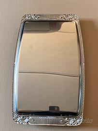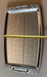 vassoio decorativo rettangolare 47x29 vintage, anni ‘50, realizzato in acciaio inox puro, a specchio e cesello, con decorazioni floreali o classiche sui bordi e manici e una finitura a specchio lavorata.Piatto da portata decorativo o vassoio per servire