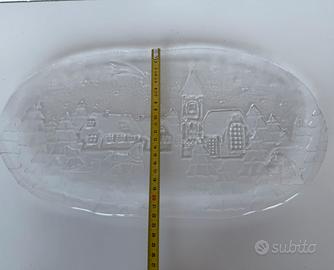 Elegante vassoio vintage in vetro satinato/acidato, produzione anni ’70–’80, con splendida scena natalizia in rilievo raffigurante villaggio innevato, chiesa, slitta e stella cometa.