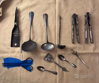 Vecchi utensili da cucina, schiaccianoci, spelino con grattugia, cucchiaini e mestoli, il tutto come da foto.