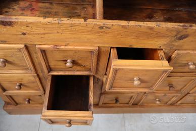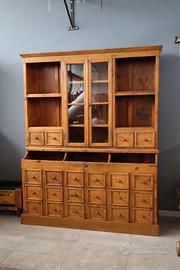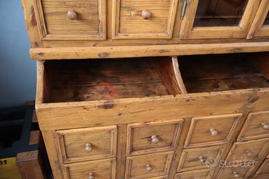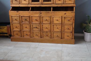 Antico mobile farmacia in abete restaurato. Alto 221cm; lungo 174cm; profondo 49cm (alzata 33cm)