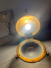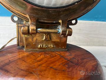 VECCHIA LAMPADA / APPLIQUE OTTONE ATTREZZATURA NAVALE (SIGLA DEL PRODUTTORE SUL DAVANTI) ACQUISTATA NEGLI ANNI '70 E' STATA APPLICATA SU BASE LEGNO E TRASFORMATA IN LAMPADA DA TAVOLO PERFETTAMENTE FUNZIONANTE DA LUCIDARE DIAMETRO BASE CM 20 ALTEZZA CM 30 PESO 4,5 KG CIRCA CONDIZIONI GENERALI DI USATO MOLTO BUONE, NORMALI SEGNI DEL TEMPO DISPONIBILI ALTRE FOTO