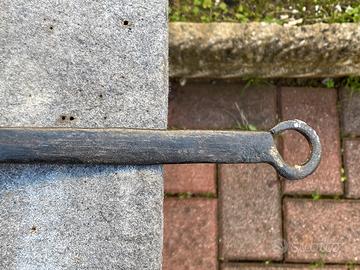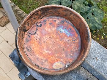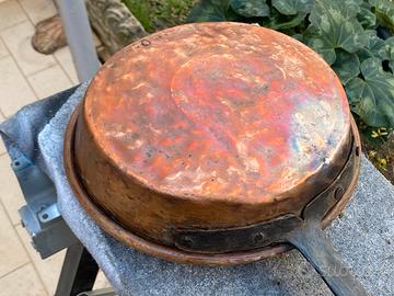 Vecchia pentola in rame con lungo manico in ferro, misura diametro cm. 25,5 e altezza cm., lunghezza complessiva cm. 71,5. Ben tenuta.