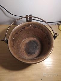 vecchia pentola rame decorativa in una cucina rustica o sulla credenza della nonna ,con manico e uno strano gancio di cui non ne so l'utilità.diametro parte alta cm 26 parte bassa cm 17 altezza pentola 14 .il gancio è 6 cm più alto