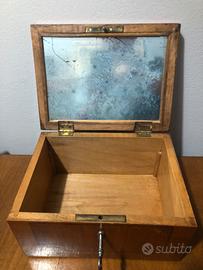 Vecchia scatola porta oggetti in legno con specchio,chiave e scomparti L 24 prof 13 h 18
