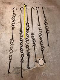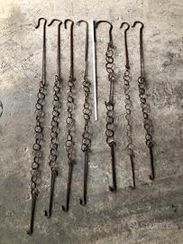 Vecchie catene per appendere i paioli sul fuoco dentro il camino. Ideali per appendere vasi floreali. 15 euro cadauna. In foto le varie misure con un metro aperto per confrronto. La spesa di spedizione sarà in base al peso e dimensioni dell’imballo.