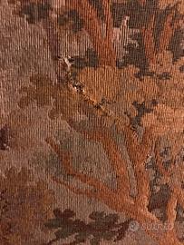 Vecchio arazzo con bellissimi decori di dimensioni che potrebbe fare anche da parete o separe ‘ e alto mt.1,45 e largo mt.2,20. Ha soltanto un piccolissimo difetto in alto a destra