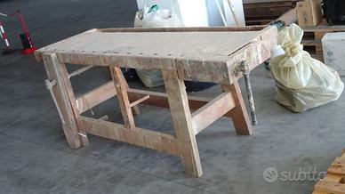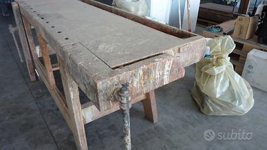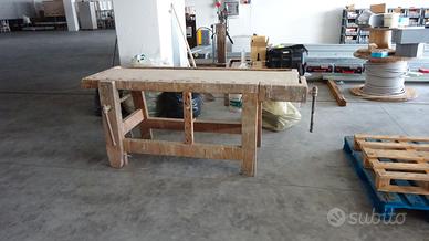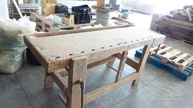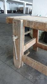 Vecchio banco da lavoro completamente intatto, funzionante con due morse. Il piano in faggio misura 200x66 più morse. Altezza 85cm