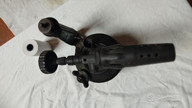 Vendo vecchio cannello fiamma ossidrica portatile in ottone, con serbatoio gas ricaricabile. Comodo manico per la presa. Altezza massima cm. 15 circa, diametro inferiore cm. 9 circa. Ottime condizioni nonostante l’età attribuibile alla prima metà del 900. Straordinario pezzo da collezione e/o arredo vecchia officina e/o da mostra fra altri vecchi attrezzi da lavoro. Come da immagini. Da collezione.