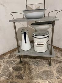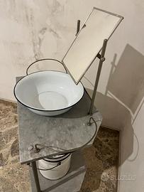 Vendo vecchio catino in marmo e ottone con specchio e vari accessori come da foto, tutti originali vintage,in ottimo stato.