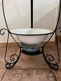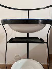 Vecchio lavabo in ferro con bacinelle in ceramica. Presenta segni di usura ma è ben conservato e funzionante