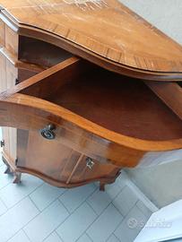 Vecchio mobile in legno, apertura su ambo i lati con doppia anta a, interno con due ripiani, chiusura con chiave e doppi cassetti.