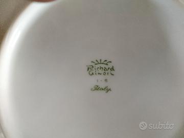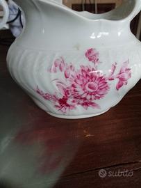 5 tazze, 5 piattini, lattiera, zuccheriera e teiera. Vecchio decoro dipinto a mano. La forma delle tazze è quella dei "galli rossi" stesso motivo.