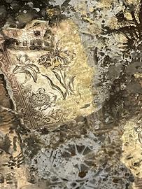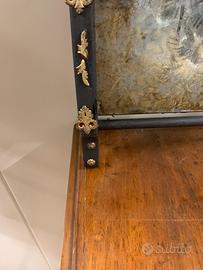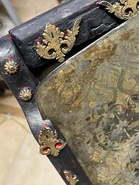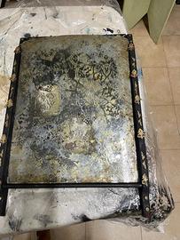 Vecchio specchio, montato su struttura in legno di colore nero e decori oro. La superficie specchiata ha stencil e decoupage, dí grande effetto Misura 40x60