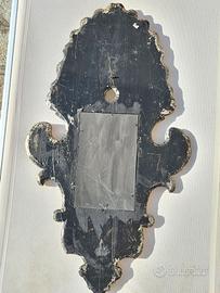 Cornice interamente in legno. Dimensioni specchio 14,5 x 24 cm. Dimensione massima cornice 42 x 74,5 cm. Gancio per appenderlo al muro. Presenti sullo specchio, come visibili in fotografia, piccoli segni del tempo.