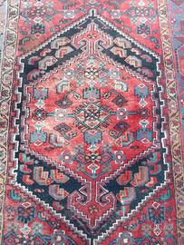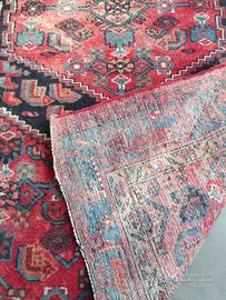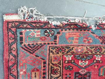 Vecchio tappeto caucasico in lana dimensioni 135x210 cm. in buono stato di conservazione presenta tuttavia il lato sinistro della prima fotografia schiarito dal sole, un bordo con parziale sfilacciatura ed alcune riparazioni eseguite nel tempo. Richiede una pulitura ed alcune riparazioni.