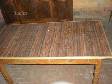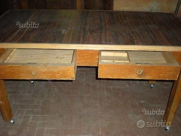 Vecchio tavolo in legno da restaurare. Misure: 161 x 81 cm, alto cm 80 cm con due cassetti, uno di questi con divisori. Il tavolo è dotato di rotelle. Probabilmente il rivestimento della superficie del tavolo è stato fatto successivamente. Ritiro diretto a carico del compratore
