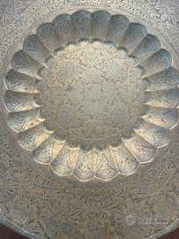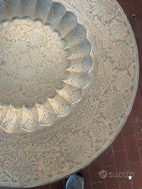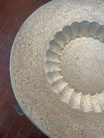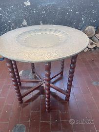 Grande vecchio tavolo da fumo con base in legno richiudibile zampe tornite e piano sopra costituito da un grande vassoio marrocchino interamente lavorato in ottone di vecchia creazione diametro 62x51 cm alto