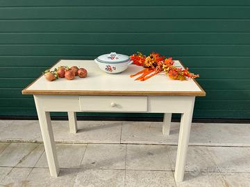 Vecchio tavolo vintage restaurato, con struttura in abete verniciato e con cassetto. Dimensioni piano 116x77 centimetri. Oggettistica della foto ovviamente non inclusa. Visione diretta e ritiro in loco o trasportabile previo accordi.