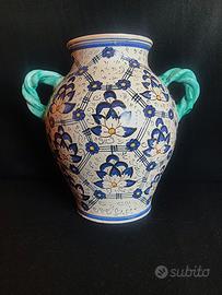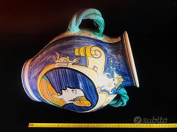 Grande Vaso in ceramica policroma biansato con fondo blu e manici verdi acqua marina, decorato nello stile classico della ceramica antica di Molte Lupo Fiorentino con raffigurazione nel fronte di figura di profilo di donna inserita all’interno di un cartiglio con grottesche, nel retro la lavorazione geometrica a rombi blu con la palmetta persiana stilizzata, nessun marchio evidente, riconducibile alla seconda metà del 900 come copia in stile. In ottimo stato come da foto misure generali cm. 34x35 base 16.