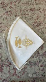 Realizzato in tessuto liscio e luminoso, decorato con un elegante ricamo dorato a motivo di pesci, antico simbolo cristiano di fede e rinascita.