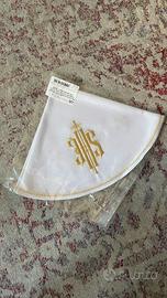 Realizzato in tessuto liscio e leggero, decorato con un elegante ricamo dorato del simbolo IHS, emblema tradizionale della fede cristiana e dell’Eucaristia.