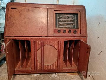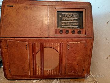 Mobile radio/giradischi anni 50' che veniva usato in casa per feste da ballo. Il prodotto è realizzato in legno noce ed è da restaurare e verificare il funzionamento. Nella parte in basso dove c'è l'auto parlante vanno applicati dei listelli di legno (che sono presenti)per rifinitura del mobile. Ai lati sono presenti due sportelli che chiudono i vani dove venivano inseriti i dischi da ascoltare. Dimensioni lunghezza cm 95, profondità cm 45 e altezza cm 90. Ritiro e trasporto a cura di chi acquista.