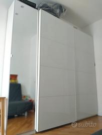 vendo Armadio Pax Ikea con ante scorrevoli in vetro bianco. l' armadio misura 2.5 lunghezza x 45 profondità. Vendo perché ho comprato.una cameretta su misura, mobile in ottimo stato, lo abbiamo da meno di 4 anni. È composto da un modulo laterale tipo scarpiera di 50 cm che eventualmente si può staccare e l'armadio di 2mt. Si richiede ritiro a casa. l' armadio è smontato. l'armadio dentro è ben organizzato con mensole, appendi pantaloni e cassetti