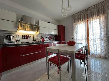 Ante laccate lucide, base amaranto e pensili bianchi con manuglie cromate.