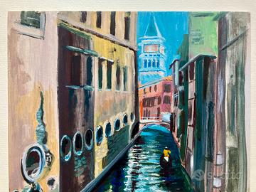 Venezia, canale con gondola e campanile di San Marco, dipinto ad olio su cartone telato, anno 1979. Dimensioni cm 30 x 40