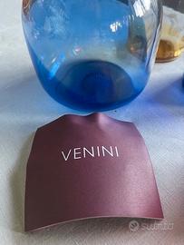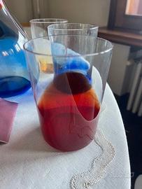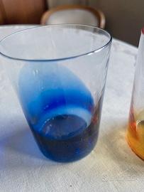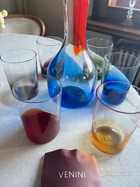 Nel 1946, in previsione della Triennale di Milano, la prima post-bellica (1947) Gio Ponti fece uno studio su alcuni servizi da tavola. Nasce così il “Servizio Pezzente”. Bicchieri e bottiglia presentano delle “pezze” di vetro colorato applicate a caldo, che rendono unico ogni elemento del servizio. La bottiglia con le sue pezze Rossa e Zaffiro è distinta dal tappo in vetro pieno in color cristallo e dalla corona in verde mela. Confezione nuovissima, anche con tappo bottiglia - in cristallo ancora con la confezione originale mai usata e con il suo sacchetto e garanzia - 6 BICCHIERI + BOTTIGLIA CON TAPPO