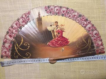 Antico ventaglio spagnolo del "900, in legno con bordura in stoffa telata e aste con immagini laccate.