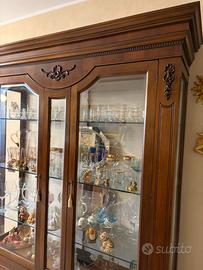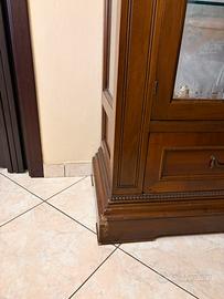 Vendo bellissima vetrina in legno massello stile classico, colore noce, con tre ante in vetro e ripiani in cristallo. Dotata di tre comodi cassetti nella parte inferiore, è molto capiente e perfetta per esporre servizi di piatti, bicchieri o oggetti da collezione.