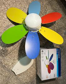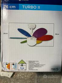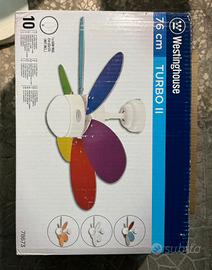 Vendo un ventilatore modello che vedete in foto perfettamente funzionante a tre velocità. vi ho allegato anche la foto con le misure. Del ventilatore ho ancora lo scatolo originale. Si possono cambiare le pale da quelle colorate a quelle bianche o color legno per abbinare ai vari ambienti.l ventilatore non ha in dotazione il telecomando ma il funzionamento è manuale.