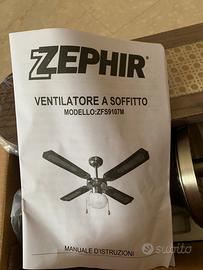 Vendo ventilatore a soffitto marca Zephir. Mai utilizzato e con alcune parti ancora da aprire. Vendo per cambio stile di arredamento.