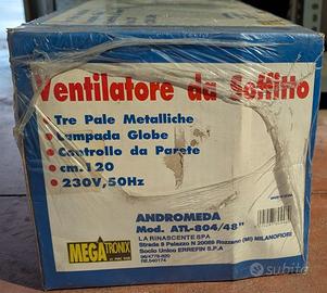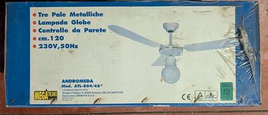 Ventilatore da soffitto con lampada, nuovo ancora imballato. Tre pale metalliche lampada globo controllo da parete 120 cm, 230 V, 50 Hz
