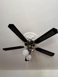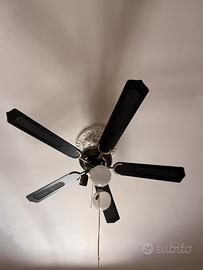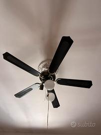 Ventilatore da soffitto dal design classico ed elegante. Dotato di 5 pale di colore scuro, si adatta facilmente a diversi stili di arredamento. È caratterizzato da triplo punto luce regolabile direzionalmente, ideale per illuminare l’ambiente oltre a rinfrescarlo. Funzionamento regolare con comando tramite cordicelle: una per la luce e una per la velocità del ventilatore. Perfetto per soggiorno, camera da letto o studio. Facile da installare e subito pronto all’uso. BUONE CONDIZIONI RITIRO DI PERSONA, NO SPEDIZIONI Se interessati contattate il 3889988860 (chiamata o whatsapp)