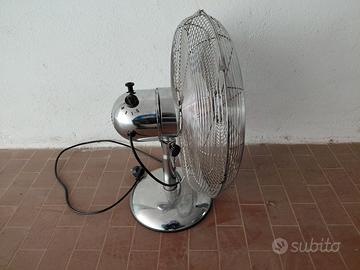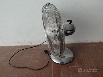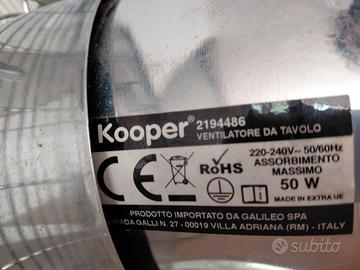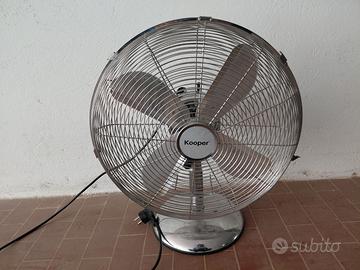 Ventilatore da tavolo Kooper modello 2194486, in ottime condizioni. Struttura interamente in metallo, molto stabile e potente. Caratteristiche tecniche: Alimentazione: 220–240V – 50/60Hz Assorbimento massimo: 50W Certificazioni: CE, RoHS Importatore: Galileo S.p.A. Materiale: metallo cromato Regolazione velocità tramite selettore posteriore ( 3 velocità e possibilità di bloccaggio rotazione ventola) Altezza 55 cm , piatto largo 45cm di diametro , base diametro 27cm