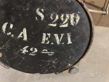 Originale ventilatore elettrico d’epoca, made in Italy tra il 1915 e il 1930, in ottone e ghisa, industriial vintage. Corpo motore in ghisa smaltata nera, pale in ottone e griglia protettiva originale in filo metallico sagomato. Sul retro del motore, sono presenti le diciture “C.A.”(corrente alternata) ed “E.V.I.“, tipiche dei primi apparecchi elettrici quando la corrente alternata non era ancora uno standard diffuso. Oggetto autentico e non restaurato, con naturale patina del tempo. Cavo e spina d’epoca presenti. Il ventilatore non è stato testato per motivi di sicurezza ed è proposto come pezzo da collezione.