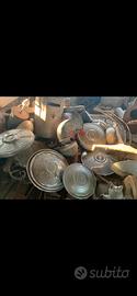Materiale vintage in foto e molto altro, voliera , stampi per bambole e pupazzi in bronzo, clacson moto Guzzi 12v , copri cerchi FIAT datati , secchi in latta vintage .prezzo sul post puramente indicativo.