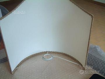 Ventola per lampada da mobile. Bella ventola per lampada da tavolo o da punto luce su mobile. Bordata su tutti i lati con elegante passamaneria. Dispositivo di attacco allo stelo della lampada. Larghezza 30 cm, altezza 29,50 cm. Purtroppo un po' sporca, ma lavabile. Euro 5,00.